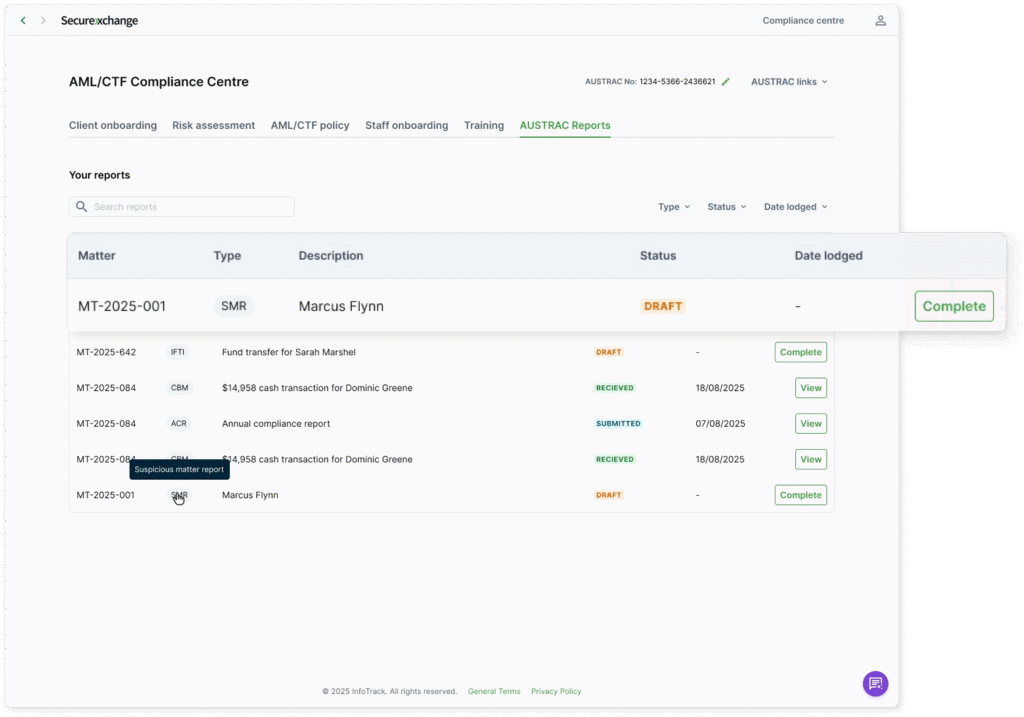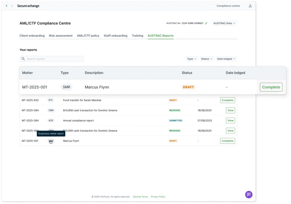 - Generate transactional reports – Suspicious Matter Reports, Transaction Threshold Reports and more, pre-filled where possible, sent directly to AUSTRAC and stored for audit